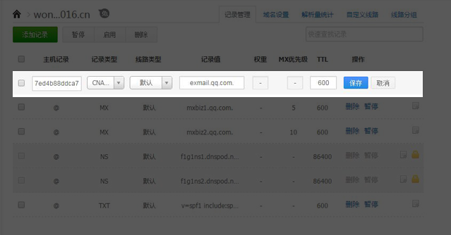 注:cname记录值不可以随便填写,请在企业邮箱重置管理员密码界面的步骤三中找到要求设置的came记录,复制黏贴到域名解析设置的相应位置。
